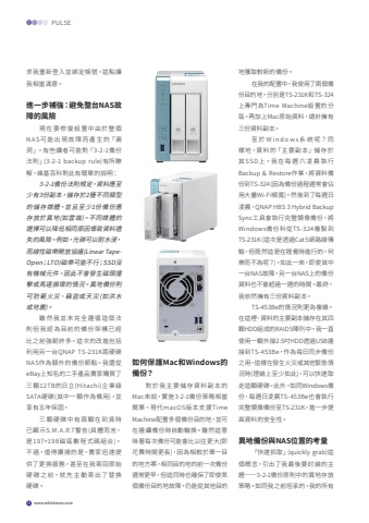 12 www.edntaiwan.comPULSE%u6c42%u6211%u91cd%u65b0%u767b%u5165%u4e26%u7d81%u5b9a%u5e33%u865f%uff0c%u9019%u9ede%u8b93%u6211%u76f8%u7576%u6eff%u610f%u3002%u9032%u4e00%u6b65%u88dc%u5f37%uff1a%u907f%u514d%u6574%u53f0NAS%u6545%u969c%u7684%u98a8%u96aa%u73fe%u5728%u8981%u4fee%u5fa9%u8a2d%u7f6e%u4e2d%u7531%u65bc%u6574%u500bN A S %u53ef%u80fd %u51fa %u73fe %u6545 %u969c %u800c %u7522 %u751f %u7684%u300c%u6f0f%u6d1e%u300d%u3002%u6709%u4e9b%u8b80%u8005%u53ef%u80fd%u5c0d%u300c3-2-1%u5099%u4efd%u6cd5%u5247%u300d(3-2-1 backup rule)%u6709%u6240%u77ad%u89e3%uff0c%u7dad%u57fa%u767e%u79d1%u5c0d%u6b64%u6709%u7c21%u55ae%u7684%u8aaa%u660e%uff1a3-2-1%u5099%u4efd%u6cd5%u5247%u898f%u5b9a%uff0c%u8cc7%u6599%u61c9%u81f3%u5c11%u67093%u4efd%u526f%u672c%uff0c%u5132%u5b58%u65bc2%u7a2e%u4e0d%u540c%u985e%u578b%u7684%u5132%u5b58%u5a92%u9ad4%uff0c%u4e26%u4e14%u81f3%u5c111%u4efd%u5099%u4efd%u61c9%u5b58%u653e%u65bc%u7570%u5730(%u5982%u96f2%u7aef)%u3002%u4e0d%u540c%u5a92%u9ad4%u7684%u9078%u64c7%u53ef%u4ee5%u964d%u4f4e%u76f8%u540c%u539f%u56e0%u5c0e%u81f4%u8cc7%u6599%u907a%u5931%u7684%u98a8%u96aa%u3002%u4f8b%u5982%uff0c%u5149%u789f%u53ef%u4ee5%u8010%u6c34%u6d78%uff0c%u800c%u7dda%u6027%u78c1%u5e36%u958b%u653e%u5354%u8b70(Linear TapeOpen%uff1bLTO)%u78c1%u5e36%u53ef%u80fd%u4e0d%u884c%uff1bSSD%u6c92%u6709%u6a5f%u68b0%u5143%u4ef6%uff0c%u56e0%u6b64%u4e0d%u6703%u767c%u751f%u78c1%u982d%u649e%u64ca%u6216%u99ac%u9054%u640d%u58de%u7684%u60c5%u6cc1%u3002%u7570%u5730%u5099%u4efd%u5247%u53ef%u9632%u7bc4%u706b %u707d%u3001%u7aca%u76dc%u6216%u5929 %u707d(%u5982%u6d2a%u6c34%u6216%u5730%u9707)%u3002%u96d6%u7136%u6211%u4e26%u672a%u5b8c%u5168%u9075%u5faa%u9019%u500b%u6cd5%u5247%u4f46%u6211%u8a8d%u70ba%u76ee%u524d%u7684%u5099%u4efd%u67b6%u69cb%u5df2%u7d93%u6bd4%u4e4b%u524d%u5f37%u97cc%u8a31%u591a%u3002%u9019%u6b21%u7684%u6539%u9032%u5305%u62ec%u5229%u7528%u53e6%u4e00%u53f0QNAP TS-231K%u5169%u786c%u789fNAS%u4f5c%u70ba%u984d%u5916%u7684%u5099%u4efd%u7bc0%u9ede%u3002%u6211%u9084%u5f9eeBay%u4e0a%u77e5%u540d%u7684%u4e8c%u624b%u7522%u54c1%u8ce3%u5bb6%u8cfc%u8cb7%u4e86%u4e09%u984612TB%u7684%u65e5%u7acb(Hitachi)%u4f01%u696d%u7d1aSATA%u786c%u789f(%u5176%u4e2d%u4e00%u9846%u4f5c%u70ba%u5099%u7528)%uff0c%u4e26%u4eab%u6709%u4e94%u5e74%u4fdd%u56fa%u3002%u4e09%u9846%u786c%u789f%u4e2d%u6709%u5169%u9846%u5728%u5230%u8ca8%u6642%u5df2%u986f%u793aS.M.A.R.T%u8b66%u544a(%u5177%u9ad4%u800c%u8a00%uff0c%u662f197+198 %u78c1%u5340%u6578%u7a0b%u5f0f%u78bc%u7d44%u5408)%u3002%u4e0d%u904e%uff0c%u503c%u5f97%u8b9a%u63da%u7684%u662f%uff0c%u8ce3%u5bb6%u8fc5%u901f%u63d0%u4f9b%u4e86%u66f4%u63db%u670d%u52d9%uff0c%u751a%u81f3%u5728%u6211%u5bc4%u56de%u539f%u59cb%u786c %u789f %u4e4b %u524d%uff0c%u5c31 %u5148 %u4e3b %u52d5 %u5bc4 %u51fa%u4e86%u66ff %u63db%u786c%u789f%u3002 %u5982%u4f55%u4fdd%u8b77Mac%u548cWindows%u7684%u5099%u4efd%uff1f%u5c0d%u65bc%u6211%u4e3b%u8981%u5132%u5b58%u8cc7%u6599%u526f%u672c%u7684Mac%u4f86%u8aaa%uff0c%u5be6%u65bd3-2-1%u5099%u4efd%u7b56%u7565%u76f8%u7576%u7c21%u55ae%u3002%u73fe%u4ee3macOS%u7248%u672c%u652f%u63f4Time Machine%u914d%u7f6e%u591a%u500b%u5099%u4efd%u76ee%u7684%u5730%uff0c%u4e26%u53ef%u5728%u9023%u7e8c%u5099%u4efd%u6642%u81ea%u52d5%u8f2a%u63db%u3002%u96d6%u7136%u9019%u610f%u5473%u8457%u6bcf%u6b21%u5099%u4efd%u53ef%u80fd%u6703%u6bd4%u4ee5%u5f80%u66f4%u5927(%u5373%u82b1%u8cbb%u6642%u9593%u66f4%u9577)%uff0c%u56e0%u70ba%u76f8%u8f03%u65bc%u55ae%u4e00%u76ee%u7684%u5730%u65b9%u6848%uff0c%u76f8%u540c%u76ee%u7684%u5730%u7684%u524d%u4e00%u6b21%u5099%u4efd%u901a%u5e38%u66f4%u65e9%uff0c%u4f46%u9019%u540c%u6642%u4e5f%u78ba%u4fdd%u4e86%u5373%u4f7f%u67d0%u500b%u5099%u4efd%u76ee%u7684%u5730%u6545%u969c%uff0c%u4ecd%u80fd%u5f9e%u5176%u4ed6%u76ee%u7684%u5730%u7372%u53d6%u8f03%u65b0%u7684%u5099%u4efd%u3002%u5728%u6211%u7684%u914d%u7f6e%u4e2d%uff0c%u6211%u4f7f%u7528%u4e86%u5169%u500b%u5099%u4efd%u76ee%u7684%u5730%uff0c%u5206%u5225%u662fTS-231K%u548cTS-324%u4e0a%u5c08%u9580%u70baTime Machine%u8a2d%u7f6e%u7684%u5206%u5340%u3002%u518d%u52a0%u4e0aMac%u539f%u59cb%u8cc7%u6599%uff0c%u7e3d%u8a08%u64c1%u6709%u4e09%u4efd%u8cc7%u6599%u526f%u672c%u3002%u81f3 %u65bc W in dow s%u7cfb %u7d71 %u5462%uff1f%u540c%u6a23%u5730%uff0c%u8cc7 %u6599%u7684%u300c%u4e3b %u8981%u526f%u672c%u300d%u5132 %u5b58 %u65bc%u5176 S S D%u4e0a%u3002%u6211 %u5728 %u6bcf %u9031 %u516d %u51cc %u6668 %u57f7%u884cBackup & Restore%u4f5c%u696d%uff0c%u5c07%u8cc7%u6599%u5099%u4efd%u5230TS-324 (%u56e0%u70ba%u5099%u4efd%u904e%u7a0b%u901a%u5e38%u6703%u4f54%u7528%u5927%u91cfWi-Fi%u983b%u5bec)%u3002%u7136%u5f8c%u5230%u4e86%u6bcf%u9031%u65e5%u51cc%u6668%uff0cQNAP HBS 3 Hybrid Backup Sync%u5de5%u5177%u6703%u57f7%u884c%u5b8c%u6574%u93e1%u50cf%u5099%u4efd%uff0c%u5c07Windows%u5099%u4efd%u6599%u5f9eTS-324%u8907%u88fd%u5230TS-231K (%u9019%u6b21%u662f%u900f%u904eCat 5%u7db2%u8def%u7dda%u50b3%u8f38%uff0c%u4f46%u65e2%u7136%u9019%u662f%u5728%u7761%u89ba%u6642%u9032%u884c%u7684%uff0c%u4f55%u6a02%u800c%u4e0d%u70ba%u5462%uff1f)%u3002%u5982%u6b64%u4e00%u4f86%uff0c%u5373%u4f7f%u5176%u4e2d%u4e00%u53f0NAS%u6545%u969c%uff0c%u53e6%u4e00%u53f0NAS%u4e0a%u7684%u5099%u4efd%u8cc7%u6599%u4e5f%u4e0d%u6703%u8d85%u904e%u4e00%u9031%u7684%u6642%u9593%u3002%u6700%u7d42%uff0c%u6211%u4f9d%u7136%u64c1%u6709%u4e09%u4efd%u8cc7%u6599%u526f%u672c%u3002TS-453Be%u7684%u60c5%u6cc1%u5247%u66f4%u70ba%u8907%u96dc%u3002%u5728%u9019%u88e1%uff0c%u8cc7%u6599%u7684%u4e3b%u8981%u526f%u672c%u5132%u5b58%u5728%u5176%u56db%u9846HDD%u7d44%u6210%u7684RAID 5%u9663%u5217%u4e2d%u3002%u6211%u4e00%u76f4%u4f7f%u7528%u4e00%u9846%u5916%u63a52.5%u540bHDD%u900f%u904eUSB%u9023%u63a5%u5230TS-453Be%uff0c%u4f5c%u70ba%u6bcf%u65e5%u540c%u6b65%u5099%u4efd%u4e4b%u7528%uff0c%u9019%u6a23%u5728%u767c%u751f%u706b%u707d%u6216%u5176%u4ed6%u7dca%u6025%u60c5%u6cc1%u6642(%u7406%u8ad6%u4e0a%u81f3%u5c11%u5982%u6b64)%uff0c%u53ef%u4ee5%u5feb%u901f%u53d6%u8d70%u9019%u9846%u786c%u789f%u3002%u6b64%u5916%uff0c%u5982%u540cWindows%u5099%u4efd%uff0c%u6bcf%u9031%u65e5%u51cc%u6668TS-453Be%u4e5f%u6703%u57f7%u884c%u5b8c%u6574%u93e1%u50cf%u5099%u4efd%u81f3TS-231K%uff0c%u9032%u4e00%u6b65%u63d0%u9ad8%u8cc7%u6599%u7684%u5b89%u5