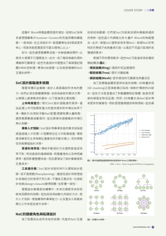 www.edntaiwan.com 23COVER STORY%u57161%uff1a%u5716%u4e2d%u5f37%u8abf%u96fb%u6676%u9ad4%u9810%u7b97%u589e%u52a0%u8207%u4f7f%u7528IP Block%u4e4b%u9593%u7684%u95dc%u4fc2%u3002 (%u4f86%u6e90%uff1aArteris%u3001https://rb.gy/qmfcn%u548chttps://rb.gy/pgdop)%u9019%u7a2eIP Block%u8207%u96fb%u6676%u9ad4%u5bc6%u5ea6%u7684%u589e%u52a0%uff0c%u4fc3%u4f7fSoC%u63a1%u7528%u591a%u8655%u7406%u5668%u53e2%u96c6(Processor Cluster)%u7684%u5148%u9032%u67b6%u69cb%u6301%u7e8c%u9032%u5c55%u3002%u4e00%u822c%u4f86%u8aaa%uff0c%u5728%u4e3b%u6d41%u8a2d%u8a08%u4e2d%uff0c%u6bcf%u500b%u53e2%u96c6%u5305%u542b8%u500b%u6216%u66f4%u591a%u6838%u5fc3%uff0c%u800c%u9ad8%u6548%u80fd%u914d%u7f6e%u751a%u81f3%u53ef%u905432%u500b%u6838%u5fc3%u4ee5%u4e0a%u3002%u5982%u4eca%uff0c%u9019%u4e9b%u8655%u7406%u5668%u53e2%u96c6%u4e26%u9032%u4e00%u6b65%u88ab%u7d44%u7e54%u6210%u9663%u5217%uff0c%u4ee5%u63d0%u4f9b%u5927%u898f%u6a21%u5e73%u884c%u904b%u7b97%u80fd%u529b%u3002%u6b64%u5916%uff0c%u70ba%u4e86%u78ba%u4fdd%u7121%u7e2b%u7684%u8cc7%u6599%u50b3%u8f38%u8207%u53ef%u64f4%u5c55%u6027%uff0c%u9019%u4e9b%u5148%u9032%u8a2d%u8a08%u4e2d%u9084%u6574%u5408%u4e86%u9ad8%u983b%u5bec%u8a18%u61b6%u9ad4(HBM)%u63a7%u5236%u5668%u3001%u5c08%u7528AI%u52a0%u901f%u5668%uff0c%u4ee5%u53ca%u9ad8%u5ea6%u8907%u96dc%u7684NoC%u4e92%u9023%u7cfb%u7d71%u7b49%u3002SoC%u8a2d%u8a08%u9762%u81e8%u8af8%u591a%u6311%u6230%u96a8%u8457%u67b6%u69cb%u65e5%u76ca%u8907%u96dc%uff0c%u8a2d%u8a08%u4eba%u54e1%u9762%u81e8%u524d%u6240%u672a%u6709%u7684%u58d3%u529b%uff0c%u4ed6%u5011%u5fc5%u9808%u514b%u670d%u7a2e%u7a2e%u969c%u7919%uff0c%u4e26%u63a1%u7528%u5275%u65b0%u7684%u89e3%u6c7a%u65b9%u6848%uff0c%u4ee5%u671f%u8ddf%u4e0a%u7522%u696d%u9700%u6c42%u7684%u8173%u6b65%u3002%u4ee5%u4e0b%u662f%u5e7e%u9805%u4e3b%u8981%u6311%u6230%uff1a%u4e0a%u5e02%u6642%u9593%u58d3%u529b%uff1a%u73fe%u4ee3SoC%u8a2d%u8a08%u9762%u81e8%u6fc0%u70c8%u7af6%u722d%uff0c%u7522%u54c1%u5ef6%u9072%u4e0a%u5e02%u53ef%u80fd%u5c0e%u81f4%u91cd%u5927%u7684%u71df%u6536%u640d%u5931%u548c%u5e02%u5834%u4f54%u6709%u7387%u4e0b%u6ed1%u3002%u50b3%u7d71%u65b9%u6cd5(%u4f8b%u5982%u624b%u52d5NoC%u914d%u7f6e)%u9700%u8981%u8017%u8cbb%u5927%u91cf%u6642%u9593%uff0c%u901a%u5e38%u9700%u8981%u6578%u9031%u6216%u6578%u500b%u6708%uff0c%u9019%u5728%u7bc0%u594f%u5feb%u901f%u8b8a%u52d5%u7684%u5e02%u5834%u5df2%u7121%u4ee5%u70ba%u7e7c%u3002%u5c08%u696d%u4eba%u624d%u77ed%u7f3a%uff1aSoC%u8a2d%u8a08%u5c0d%u5c08%u696d%u6280%u80fd%u7684%u9700%u6c42%u6210%u9577%u901f%u5ea6%u9060%u8d85%u904e%u4eba%u624d%u4f9b%u61c9%u3002%u5de5%u7a0b%u5718%u968a%u5f80%u5f80%u5de5%u4f5c%u8ca0%u64d4%u904e%u91cd%uff0c%u5c0e%u81f4%u8cc7%u6df1%u5c08%u5bb6%u82b1%u592a%u591a%u6642%u9593%u5728%u91cd%u8907%u6027%u7684%u624b%u52d5%u4efb%u52d9%u4e0a%uff0c%u800c%u975e%u7b56%u7565%u6027%u7684%u9ad8%u50f9%u503c%u8a2d%u8a08%u6c7a%u7b56%u3002%u8cc7%u6e90%u5229%u7528%u7387%u4f4e%uff1a%u50b3%u7d71%u624b%u52d5%u8a2d%u8a08%u65b9%u6cd5%u901a%u5e38%u6703%u9020%u6210%u6548%u7387%u4e0d%u5f70%uff0c%u4f8b%u5982%u904e%u9577%u7684%u9023%u7dda%u7dda%u8def%u3001%u8017%u96fb%u91cf%u589e%u52a0%u4ee5%u53ca%u4f48%u5c40%u64c1%u64e0%u7b49%uff0c%u9032%u800c%u5f71%u97ff%u6574%u9ad4%u6548%u80fd%uff0c%u800c%u4e14%u9084%u589e%u52a0%u4e86%u8a2d%u8a08%u8907%u96dc%u5ea6%u548c%u751f%u7522%u6210%u672c%u3002%u5de5%u5177%u93c8%u5206%u6563%uff1aSoC%u8a2d%u8a08%u6d41%u7a0b%u7684%u788e%u7247%u5316%u5c0e%u81f4%u8a2d%u8a08%u74f6%u9838%uff0c%u5f9e%u5e73%u9762%u898f%u5283(floorplanning)%u3001%u9023%u63a5%u6027%u8a2d%u8a08%u5230%u7269%u7406%u8a2d%u8a08%u5404%u968e%u6bb5%u5206%u5225%u4f7f%u7528%u4e0d%u540c%u5de5%u5177%uff0c%u4e0d%u50c5%u7f3a%u4e4f%u6574%u5408%u6027%uff0c%u4e5f%u4f7f%u8a2d%u8a08%u6536%u6582(design closure)%u8b8a%u5f97%u56f0%u96e3%uff0c%u4e26%u5f71%u97ff%u4e00%u81f4%u6027%u3002%u96a8%u8457%u8a2d%u8a08%u8907%u96dc%u5ea6%u6301%u7e8c%u6500%u5347%uff0c%u672a%u4f86%u4ecd%u9700%u66f4%u591a%u6280%u8853%u7a81%u7834%u4f86%u56e0%u61c9%u65b0%u7684%u6311%u6230%u3002%u9019%u5305%u62ec%u63a1%u7528%u81ea%u52d5%u5316%u7684%u8a2d%u8a08%u65b9%u6cd5%u3001%u63d0%u5347%u4eba%u624d%u57f9%u8a13%u3001%u589e%u5f37%u5718%u968a%u7684%u5c08%u696d%u80fd%u529b%uff0c%u4ee5%u53ca%u6574%u5408%u5de5%u5177%u93c8%u4f86%u7c21%u5316%u5de5%u4f5c%u6d41%u7a0b%u4e26%u63d0%u5347%u6548%u7387%u3002NoC%u7684%u95dc%u9375%u89d2%u8272%u8207%u62d3%u64b2%u8a2d%u8a08%u70ba%u4e86%u56e0%u61c9%u5982%u6b64%u524d%u6240%u672a%u6709%u7684%u6311%u6230%uff0c%u5148%u9032%u7684NoC%u4e92%u9023%u6280%u8853%u6210%u70ba%u95dc%u9375%uff0c%u5b83%u5011%u662fSoC%u5167%u90e8%u9ad8%u6548%u8cc7%u6599%u50b3%u8f38%u8207%u901a%u8a0a%u7684%u9aa8%u5e79%u3002%u9019%u4e9b%u6676%u7247%u5167%u7db2%u8def%u5141%u8a31%u5927%u91cfIP Block%u7684%u7121%u7e2b%u6574%u5408%u3002%u6b64%u5916%uff0c%u9ad8%u968eSoC%u901a%u5e38%u63a1%u7528%u591a%u500bNoC%uff0c%u6bcf%u500bNoC%u91dd%u5c0d%u7279%u5b9a%u4efb%u52d9%u6216%u5b50%u7cfb%u7d71%u91cf%u8eab%u6253%u9020%uff0c%u4ee5%u6eff%u8db3%u4e0d%u540c%u6676%u7247%u5340%u57df%u7684%u5404%u7a2e%u901a%u8a0a%u9700%u6c42%u3002%u6839%u64da%u4e0d%u540c%u7684%u61c9%u7528%u9700%u6c42%uff0c%u9019%u4e9bNoC%u53ef%u80fd%u6703%u63a1%u7528%u5404%u7a2e%u62d3%u6a38%u7d50%u69cb(%u5982%u57162)%uff1a%u30fb%u74b0%u72c0%u7d50%u69cb(Ring)%uff1a%u9069%u7528%u65bc%u4f4e%u5ef6%u9072%u901a%u8a0a%u30fb%u6a39%u72c0%u7d50%u69cb(Tree)%uff1a%u4fbf%u65bc%u5206%u5c64%u7d44%u7e54%u30fb%u7db2%u72c0%u7d50%u69cb(Mesh)%uff1a%u63d0%u4f9b%u66f4%u4f73%u7684%u53ef%u64f4%u5c55%u6027%u8207%u9748%u6d3b%u6027%u70ba%u4e86%u56e0%u61c9%u96fb%u6676%u9ad4%u5bc6%u5ea6%u8207%u6548%u80fd%u7684%u6311%u6230%uff0c3D%u5806%u758a%u6280%u8853(3D stacking)%u6b63%u9010%u6f38%u88ab%u5ee3%u6cdb%u63a1%u7528%u3002%u76f8%u8f03%u65bc%u50b3%u7d71%u76842D%u8a2d%u8a08%uff0c%u9019%u4e9b%u65b9%u6cd5%u5782%u76f4%u6574%u5408%u4e86%u591a%u5c64%u908f%u8f2f%u548c%u8a18%u61b6%u9ad4%uff0c%u80fd%u63d0%u4f9b%u66f4%u9ad8%u7684%u983b%u5bec%u4e26%u964d%u4f4e%u5ef6%u9072%u3002%u7136%u800c%uff0c3D%u5806%u758a%u4e5f%u70baNoC%u8a2d%u8a08%u5e36%u4f86%u66f4%u591a%u7684%u8907%u96dc%u6027%uff0c%u4f8b%u5982%u7ba1%u7406%u5c64%u9593%u901a%u8a0a%u8207%u71b1%u9650%u5236%uff0c%u9019%