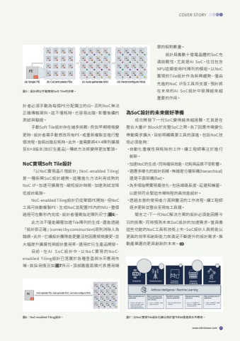 www.edntaiwan.com 25COVER STORY%u8a08%u8005%u5fc5%u9808%u624b%u52d5%u70ba%u6bcf%u500bPE%u5206%u914d%u7368%u7acb%u7684ID%uff0c%u5426%u5247NoC%u7121%u6cd5%u6b63%u78ba%u50b3%u8f38%u8cc7%u6599%u3002%u9019%u4e0d%u50c5%u8017%u6642%uff0c%u4e5f%u5bb9%u6613%u51fa%u932f%uff0c%u5f71%u97ff%u5f8c%u7e8c%u7684%u6e2c%u8a66%u8207%u9a57%u8b49%u3002%u624b%u52d5Soft Tile%u8a2d%u8a08%u5b58%u5728%u8af8%u591a%u6311%u6230%uff0c%u4f8b%u5982%u65e9%u671f%u898f%u683c%u8b8a%u66f4%u6642%uff0c%u8a2d%u8a08%u8005%u9700%u624b%u52d5%u4fee%u6539%u6240%u6709PE%uff0c%u6216%u91cd%u65b0%u8907%u88fd%u4e26%u9032%u884c%u6574%u500b%u6d41%u7a0b%uff0c%u7686%u6613%u51fa%u932f%u4e14%u8017%u6642%u3002%u6b64%u5916%uff0c%u7576%u9700%u8981%u5c074%u00d74%u9663%u5217%u64f4%u5c55%u81f38%u00d78%u7248%u672c(%u5982%u884d%u751f%u7522%u54c1)%uff0c%u50b3%u7d71%u65b9%u6cd5%u5c07%u8b8a%u5f97%u66f4%u52a0%u7e41%u7463%u3002NoC%u5be6%u73feSoft Tile%u8a2d%u8a08%u300c%u4ee5NoC%u5be6%u73fe%u6676%u7247%u584a%u8a2d%u8a08%u300d(NoC-enabled Tiling)%u662f%u4e00%u7a2e%u65b0%u8208SoC%u8a2d%u8a08%u8da8%u52e2%u3002%u9019%u7a2e%u9032%u5316%u65b9%u6cd5%u5229%u7528%u6210%u719f%u7684NoC IP%uff0c%u52a0%u901f%u53ef%u64f4%u5c55%u6027%u3001%u7e2e%u77ed%u8a2d%u8a08%u6642%u9593%u3001%u52a0%u901f%u6e2c%u8a66%u4e26%u964d%u4f4e%u8a2d%u8a08%u98a8%u96aa%u3002NoC-enabled Tiling%u8a2d%u8a08%u4ecd%u5f9e%u55ae%u500bPE%u958b%u59cb%uff0c%u4f46NoC%u5de5%u5177%u53ef%u81ea%u52d5%u8907%u88fdPE%u3001%u751f%u6210NoC%u4e26%u914d%u7f6ePE%u5167%u7684NIU%uff0c%u6574%u500b%u904e%u7a0b%u53ef%u5728%u6578%u79d2%u5167%u5b8c%u6210%uff0c%u8a2d%u8a08%u8005%u50c5%u9700%u6307%u5b9a%u9663%u5217%u5c3a%u5bf8(%u57166)%u3002%u6b64%u65b9%u6cd5%u4e0d%u50c5%u80fd%u986f%u8457%u52a0%u901fTile%u9663%u5217%u7684%u751f%u6210%uff0c%u9084%u80fd%u900f%u904e%u300c%u8a2d%u8a08%u5373%u6b63%u78ba%u300d(correct by construction)%u539f%u5247%u6d88%u9664%u4eba%u70ba%u932f%u8aa4%u3002%u6b64%u5916%uff0c%u5b83%u8b93%u8a2d%u8a08%u5718%u968a%u80fd%u66f4%u9748%u6d3b%u5730%u56e0%u61c9%u898f%u683c%u8b8a%u66f4%uff0c%u4e26%u5927%u5e45%u63d0%u5347%u64f4%u5c55%u6027%u8207%u8a2d%u8a08%u91cd%u7528%u7387%uff0c%u9069%u7528%u65bc%u884d%u751f%u7522%u54c1%u958b%u767c%u3002%u76ee%u524d%uff0c%u5728 A I S o C %u8a2d %u8a08 %u4e2d%uff0c%u4ee5 N o C %u5be6 %u73fe %u7684 N o C -enabled Tiling%u8a2d%u8a08%u5df2%u843d%u5be6%u65bc%u5404%u7a2e%u5782%u76f4%u8207%u6c34%u5e73%u61c9%u7528%u5e02%u5834%uff0c%u5176%u63a1%u7528%u60c5%u6cc1%u5982%u57167%u6240%u793a%uff0c%u9802%u90e8%u5713%u5708%u9762%u7a4d%u4ee3%u8868%u61c9%u7528%u5834%u666f%u7684%u76f8%u5c0d%u6578%u91cf%u3002%u8a2d%u8a08%u5177%u5099%u6578%u5341%u5104%u96fb%u6676%u9ad4%u7684SoC%u5145%u6eff%u6311%u6230%u6027%uff0c%u5c24%u5176%u662fAI SoC%uff0c%u5f80%u5f80%u5305%u542bNPU%u9019%u985e%u4f7f%u7528PE%u9663%u5217%u7684%u6a21%u7d44%u3002%u4ee5NoC%u5be6%u73fe%u7684Tile%u8a2d%u8a08%u4f5c%u70ba%u65b0%u8208%u8da8%u52e2%uff0c%u50c5%u7531%u5148%u9032%u7684NoC IP%u53ca%u5de5%u5177%u6240%u652f%u63f4%uff0c%u9810%u8a08%u5c07%u5728%u672a%u4f86%u7684AI SoC%u8a2d%u8a08%u4e2d%u767c%u63ee%u8d8a%u4f86%u8d8a%u91cd%u8981%u7684%u4f5c%u7528%u3002%u70baSoC%u8a2d%u8a08%u7684%u672a%u4f86%u505a%u597d%u6e96%u5099%u6210%u529f%u958b%u767c%u4e0b%u4e00%u4ee3SoC%u8b8a%u5f97%u8d8a%u4f86%u8d8a%u56f0%u96e3%uff0c%u5c24%u5176%u662f%u5728%u6574%u5408%u5927%u91cfIP Block%u65bc%u5b8c%u6574SoC%u4e4b%u969b%u3002%u70ba%u4e86%u56e0%u61c9%u5e02%u5834%u8b8a%u5316%u5e36%u52d5%u9700%u6c42%u64f4%u5927%uff0c%u76ee%u524d%u660e%u986f%u9700%u8981%u5de5%u5177%u7684%u6f14%u9032%uff0c%u5305%u62ecNoC%u6280%u8853%u5fc5%u9808%u80fd%u5920%uff1a%u30fb%u81ea%u52d5%u5316%u91cd%u8907%u6027%u8207%u8017%u6642%u7684%u5de5%u4f5c%uff0c%u8b93%u5de5%u7a0b%u5e2b%u5c08%u6ce8%u65bc%u9032%u884c%u5275%u65b0%u3002%u30fb%u52a0%u901fNoC%u7684%u751f%u6210%uff0c%u540c%u6642%u78ba%u4fdd%u6548%u80fd%u3001%u529f%u8017%u8207%u54c1%u8cea%u4e0d%u53d7%u5f71%u97ff%u3002%u30fb%u9069%u61c9%u591a%u6a23%u5316%u7684%u8a2d%u8a08%u62d3%u6a38%uff0c%u7121%u8ad6%u662f%u5206%u5c64%u67b6%u69cb(hierarchical)%u9084%u662f%u5e73%u9762%u67b6%u69cb(flat)%u3002%u30fb%u70ba%u591a%u9805%u6307%u6a19%u5be6%u73fe%u6700%u4f73%u5316%uff0c%u5305%u62ec%u7dda%u8def%u9577%u5ea6%u3001%u5ef6%u9072%u548c%u64c1%u585e%uff0c%u4ee5%u63d0%u4f9b%u7b26%u5408%u7dca%u8feb%u5e02%u5834%u6642%u7a0b%u7684%u9ad8%u6548%u80fd%u8a2d%u8a08%u3002%u30fb%u900f%u904e%u53cb%u5584%u7684%u4f7f%u7528%u8005%u4ecb%u9762%u8207%u9748%u6d3b%u7684%u5de5%u4f5c%u6d41%u7a0b%uff0c%u8b93%u5de5%u7a0b%u5e2b%u9010%u6b65%u66f4%u65b0%u4e26%u6574%u5408%u81f3%u73fe%u6709%u5de5%u5177%u93c8%u3002%u7c21%u8a00%u4e4b%uff0c%u4e0b%u4e00%u4ee3NoC%u89e3%u6c7a%u65b9%u6848%u7684%u8a2d%u8a08%u5fc5%u9808%u80fd%u56e0%u61c9%u4eca%u65e5%u7684%u6311%u6230%uff0c%u540c%u6642%u9810%u6e2c%u672a%u4f86SoC%u8a2d%u8a08%u7684%u52a0%u901f%u9700%u6c42%u3002%u7576%u5177%u5099%u9019%u4e9b%u529f%u80fd%u7684NoC%u5de5%u5177%u548c%u6280%u8853%u4e0a%u5e02%uff0cSoC%u8a2d%u8a08%u4eba%u54e1%u5c07%u80fd%u4ee5%u66f4%u9ad8%u7684%u6548%u7387%u548c%u5275%u65b0%u80fd%u529b%u4f86%u6eff%u8db3%u4e0d%u65b7%u63d0%u5347%u7684%u8a2d%u8a08%u9700%u6c42%uff0c%u63a8%u52d5%u7522%u696d%u9081%u5411%u66f4%u5177%u5275%u65b0%u7684%u672a%u4f86%u3002%u57166%uff1aNoC-enabled Tiling%u8a2d%u8a08%u3002 %u57167%uff1a%u4ee5NoC%u5be6%u73feTile%u8a2d%u8a08%u5df2%u5ee3%u6cdb%u7528%u65bc%u7576%u4eca%u7684AI%u5782%u76f4%u8207%u6c34%u5e73%u61c9%u7528%u3002%u57165%uff1a%u8a2d%u8a08%u5e2b%u4ee5%u624b%u52d5%u5be6%u73feSoft Tile%u7684%u6b65%u9a5f%u3002