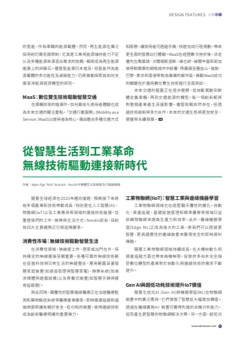 www.edntaiwan.com 33DESIGN FEATURES%u96a8%u8457%u5168%u7403%u7d93%u6fdf%u57282025%u5e74%u9081%u5411%u5fa9%u7526%uff0c%u9810%u671f%u63a5%u4e0b%u4f86%u5c07%u6709%u591a%u500b%u7522%u696d%u548c%u6280%u8853%u5e36%u52d5%u6210%u9577%uff0c%u7279%u5225%u662f%u5728%u4eba%u5de5%u667a%u6167(AI)%u3001%u7269%u806f%u7db2(IoT)%u4ee5%u53ca%u5de5%u696d%u61c9%u7528%u7b49%u9818%u57df%u7684%u9023%u63a5%u6280%u8853%u9032%u5c55%uff0c%u4e26%u91cd%u5851%u6211%u5011%u7684%u5de5%u4f5c%u3001%u5a1b%u6a02%u8207%u751f%u6d3b%u65b9%u5f0f%u3002Nordic%u8a8d%u70ba%uff0c%u76ee%u524d%u6709%u56db%u5927%u4e3b%u8981%u8da8%u52e2%u6b63%u5f15%u9818%u9019%u5834%u8b8a%u9769%u3002%u6d88%u8cbb%u6027%u5e02%u5834%uff1a%u7121%u7dda%u6280%u8853%u9a45%u52d5%u667a%u6167%u751f%u6d3b%u5728%u6d88%u8cbb%u6027%u9818%u57df%uff0c%u7121%u8ad6%u662f%u5de5%u4f5c%u3001%u5c45%u5bb6%u6216%u51fa%u9580%u5728%u5916%uff0c%u4fdd%u6301%u7a69%u5b9a%u7684%u7121%u7dda%u9023%u63a5%u81f3%u95dc%u91cd%u8981%u3002%u5404%u7a2e%u53ef%u9760%u7684%u7121%u7dda%u6280%u8853%u90fd%u5728%u4fc3%u9032%u79d1%u6280%u8207%u65e5%u5e38%u751f%u6d3b%u7684%u7121%u7e2b%u6574%u5408%uff0c%u61c9%u7528%u7bc4%u570d%u6db5%u84cb%u667a%u6167%u5bb6%u5ead%u88dd%u7f6e(%u5982%u8a9e%u97f3%u52a9%u7406%u8207%u667a%u6167%u5bb6%u96fb)%u3001%u5a1b%u6a02%u7cfb%u7d71(%u5982%u4e32%u6d41%u5a92%u9ad4%u8207%u904a%u6232%u8a2d%u5099)%u4ee5%u53ca%u7a7f%u6234%u5f0f%u88dd%u7f6e(%u5982%u667a%u6167%u624b%u9336%u8207%u5065%u8eab%u8ffd%u8e64%u5668)%u3002%u8207%u6b64%u540c%u6642%uff0c%u985b%u8986%u6027%u7684%u667a%u6167%u9023%u7dda%u91ab%u7642%u6b63%u5728%u52a0%u901f%u91ab%u7642%u76e3%u6e2c%u548c%u85e5%u7269%u8f38%u9001%u7cfb%u7d71%u7b49%u91ab%u7642%u7522%u696d%u8b8a%u9769%u3002%u5373%u6642%u5065%u5eb7%u8ffd%u8e64%u548c%u9060%u7aef%u75c5%u60a3%u7167%u8b77%u6709%u8cf4%u65bc%u5b89%u5168%u3001%u4f4e%u529f%u8017%u7684%u88dd%u7f6e%uff0c%u4f7f%u5f97%u9023%u7dda%u6280%u8853%u6210%u70ba%u5275%u65b0%u91ab%u7642%u7167%u8b77%u7684%u91cd%u8981%u63a8%u529b%u3002%u5de5%u696d%u7269%u806f%u7db2(IIoT)%uff1a%u667a%u6167%u5de5%u696d%u8207%u908a%u7de3%u6a5f%u5668%u5b78%u7fd2%u5de5%u696d%u7269%u806f%u7db2%u9818%u57df%u4e5f%u5728%u7d93%u6b77%u7ffb%u5929%u8986%u5730%u7684%u8b8a%u5316%u3002%u81ea%u52d5%u5316%u3001%u8cc7%u7522%u8ffd%u8e64%u3001%u57fa%u790e%u8a2d%u65bd%u7ba1%u7406%u548c%u7cbe%u6e96%u8fb2%u696d%u7b49%u9818%u57df%u65e5%u76ca%u4f9d%u8cf4%u7269%u806f%u7db2%u4f86%u63d0%u9ad8%u751f%u7522%u529b%u548c%u6548%u7387%u3002%u6b64%u5916%uff0c%u908a%u7de3%u6a5f%u5668%u5b78%u7fd2(Edge ML)%u6b63%u6210%u70ba%u5f37%u5927%u7684%u5de5%u5177%uff0c%u4f7f%u6211%u5011%u53ef%u4ee5%u900f%u904e%u66f4%u667a%u6167%u3001%u66f4%u5177%u9069%u61c9%u6027%u7684%u908a%u7de3%u88dd%u7f6e%u4f86%u5be6%u73fe%u5b89%u5168%u7684%u5373%u6642%u8cc7%u6599%u50b3%u8f38%u3002%u96a8%u8457%u5de5%u696d%u7269%u806f%u7db2%u9818%u57df%u6301%u7e8c%u6210%u9577%uff0c%u5728%u5927%u6a13%u81ea%u52d5%u5316%u548c%u8cc7%u7522%u8ffd%u8e64%u65b9%u9762%u4e5f%u5e36%u4f86%u5546%u6a5f%u7121%u9650%uff0c%u4fc3%u4f7f%u8a31%u591a%u5c1a%u672a%u5b8c%u5168%u63a5%u53d7%u6578%u4f4d%u8f49%u578b%u7684%u7522%u696d%u5c0d%u65bc%u81ea%u52d5%u5316%u8207%u9023%u7dda%u6280%u8853%u7684%u9700%u6c42%u4e0d%u65b7%u63d0%u5347%u3002Gen AI%u8207%u8d85%u4f4e%u529f%u8017%u6280%u8853%u63d0%u5347IoT%u50f9%u503c%u96a8%u8457%u751f%u6210%u5f0fAI (Gen AI)%u8207%u6a5f%u5668%u5b78%u7fd2(ML)%u5728%u7269%u806f%u7db2%u88dd%u7f6e%u4e2d%u7684%u5ee3%u6cdb%u61c9%u7528%uff0c%u5b83%u5011%u589e%u5f37%u4e86%u667a%u6167%u4e26%u5927%u5e45%u589e%u52a0%u50f9%u503c%u3002%u900f%u904e%u5728%u908a%u7de3%u5be6%u65bdAI%uff0c%u88dd%u7f6e%u53ef%u7372%u5f97%u5148%u9032%u7684%u672c%u6a5f%u5206%u6790%u80fd%u529b%uff0c%u5f9e%u800c%u7522%u751f%u66f4%u667a%u6167%u7684%u7269%u806f%u7db2%u89e3%u6c7a%u65b9%u6848%u3002%u53e6%u4e00%u65b9%u9762%uff0c%u8d85%u4f4e%u529f%u5f9e%u667a%u6167%u751f%u6d3b%u5230%u5de5%u696d%u9769%u547d%u3000%u7121%u7dda%u6280%u8853%u9a45%u52d5%u9023%u63a5%u65b0%u6642%u4ee3%u4f5c%u8005%uff1aBj%u00f8rn %u00c5ge \%u7684%u6c2b%u80fd%uff0c%u4f5c%u70ba%u8eca%u8f1b%u7684%u80fd%u6e90%u8f09%u9ad4%u3002%u7136%u800c%uff0c%u518d%u751f%u80fd%u6e90%u5728%u5ee3%u6cdb%u63a1%u7528%u524d%u4ecd%u9700%u514b%u670d%u9650%u5236%uff0c%u5c24%u5176%u662f%u5de5%u696d%u7528%u80fd%u6e90%u5132%u5b58%u80fd%u529b%u4e0d%u8db3%u4ee5%u53ca%u591a%u7a2e%u80fd%u6e90%u4f86%u6e90%u6df7%u5408%u9700%u6c42%u7684%u6311%u6230%uff0c%u90fd%u5c07%u6210%u70ba%u518d%u751f%u80fd%u6e90%u9032%u5c55%u4e0a%u7684%u7d46%u8173%u77f3%u3002%u5118%u7ba1%u6c2b%u80fd%u8eca%u4ecd%u672a%u666e%u53ca%uff0c%u4f46%u6c2b%u80fd%u4f5c%u70ba%u80fd%u6e90%u8f09%u9ad4%u7684%u591a%u529f%u80fd%u6027%u53ca%u6e1b%u78b3%u80fd%u529b%uff0c%u4ecd%u5c07%u63a8%u52d5%u63a2%u7d22%u5176%u5982%u4f55%u652f%u63f4%u6f54%u6de8%u80fd%u6e90%u7d93%u6fdf%u8f49%u578b%u7684%u7814%u7a76%u3002MaaS%uff1a%u6578%u4f4d%u96d9%u751f%u6280%u8853%u9a45%u52d5%u667a%u6167%u4ea4%u901a%u5728%u8eca%u8f1b%u6280%u8853%u7684%u9032%u5c55%u5916%uff0c%u5982%u4f55%u6700%u4f73%u5316%u4f7f%u7528%u8005%u9ad4%u9a57%u4e5f%u6210%u70ba%u672a%u4f86%u4ea4%u901a%u7684%u95dc%u6ce8%u91cd%u9ede%u3002%u300c%u4ea4%u901a%u884c%u52d5%u670d%u52d9%u300d(Mobility as a Service%uff1bMaaS)%u4ee5%u4f7f%u7528%u8005%u70ba%u6838%u5fc3%uff0c%u85c9%u7531%u6574%u5408%u591a%u7a2e%u4ea4%u901a%u65b9%u5f0f%u548c%u670d%u52d9%uff0c%u8b93%u4f7f%u7528%u8005%u53ef%u900f%u904e%u624b%u6a5f%uff0c%u5feb%u901f%u5b8c%u6210%u884c%u7a0b%u898f%u5283%uff0c%u5e36%u4f86%u66f4%u5168%u9762%u7684%u667a%u6167%u51fa%u884c%u9ad4%u9a57%u3002MaaS%u5728%u7d93%u6b77%u6578%u6b21%u632b%u6298%u5f8c%uff0c%u6c7a%u5b9a%u512a%u5148%u5728%u9cf3%u51f0%u57ce%u3001%u7c73%u723e%u9813%u51f1%u6069%u65af%u3001%u7dad%u4e5f%u7d0d%u3001%u8d6b%u723e%u8f9b%u57fa%u548c%u65b0%u52a0%u5761%u7b49%u8f03%u7c21%u55ae%u7684%u7db2%u683c%u57ce%u5e02%u4e2d%u90e8%u7f72%uff0c%u518d%u64f4%u5c55%u81f3%u820a%u91d1%u5c71%u3001%u502b%u6566%u3001%u5df4%u9ece%u3001%u6771%u4eac%u548c%u9999%u6e2f%u7b49%u8f03%u70ba%u8907%u96dc%u7684%u90fd%u5e02%u5340%u3002%u63a8%u52d5MaaS%u6210%u529f%u7684%u95dc%u9375%u5728%u65bc%u904b%u7528%u6578%u4f4d%u96d9%u751f%u6280%u8853%u9032%