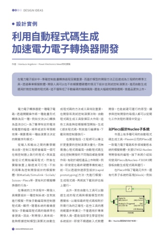 36 www.edntaiwan.comDESIGN IDEAS%u4f5c%u8005%uff1aGianluca Angelone%uff0cPower Electronics News%u7279%u7d04%u64b0%u7a3f%u5229%u7528%u81ea%u52d5%u7a0b%u5f0f%u78bc%u751f%u6210%u52a0%u901f%u96fb%u529b%u96fb%u5b50%u8f49%u63db%u5668%u958b%u767c %u8a2d%u8a08%u5be6%u4f8b%u5728%u96fb%u529b%u96fb%u5b50%u8a2d%u8a08%u4e2d%uff0c%u6e96%u78ba%u63a7%u5236%u80fd%u91cf%u8f49%u63db%u904e%u7a0b%u81f3%u95dc%u91cd%u8981%uff0c%u800c%u57fa%u65bc%u6a21%u578b%u7684%u958b%u767c%u65b9%u6cd5%u6b63%u8fc5%u901f%u6210%u70ba%u5de5%u7a0b%u5e2b%u7684%u6a19%u6e96%u5de5%u5177%u3002%u900f%u904e%u5c08%u696d%u6a21%u64ec%u8edf%u9ad4%uff0c%u958b%u767c%u4eba%u54e1%u53ef%u4ee5%u5728%u4e0d%u4f9d%u8cf4%u5be6%u9ad4%u786c%u9ad4%u7684%u60c5%u6cc1%u4e0b%u8a2d%u8a08%u4e26%u6e2c%u8a66%u63a7%u5236%u6f14%u7b97%u6cd5%uff0c%u9032%u800c%u81ea%u52d5%u751f%u6210%u9069%u7528%u65bc%u5fae%u63a7%u5236%u5668%u7684%u7a0b%u5f0f%u78bc%u3002%u9019%u4e0d%u50c5%u964d%u4f4e%u4e86%u624b%u52d5%u7de8%u78bc%u7684%u932f%u8aa4%u98a8%u96aa%uff0c%u9084%u80fd%u5927%u5e45%u7e2e%u77ed%u958b%u767c%u9031%u671f%uff0c%u4f7f%u7522%u54c1%u66f4%u5feb%u4e0a%u5e02%u3002%u96fb%u529b%u96fb%u5b50%u8f49%u63db%u5668%u662f%u4e00%u7a2e%u96fb%u5b50%u96fb%u8def%uff0c%u900f%u904e%u958b%u95dc%u64cd%u4f5c%u5c07%u4e00%u7a2e%u80fd%u91cf%u5f62%u5f0f%u8f49%u63db%u70ba%u53e6%u4e00%u7a2e%uff0c%u4f8b%u5982%u4ea4%u6d41(AC)%u8f49%u63db%u70ba%u76f4%u6d41(DC)%u3002%u70ba%u4e86%u7372%u5f97%u7279%u5b9a%u7684%u96fb%u6d41%u548c%u96fb%u58d3%u7684%u5e45%u503c%u3001%u983b%u7387%u6216%u6ce2%u5f62%u7b49%u9810%u671f%u6548%u679c%uff0c%u9700%u8981%u61c9%u7528%u4e00%u7a2e%u7531%u6f14%u7b97%u6cd5%u6c7a%u5b9a%u7684%u958b%u95dc%u5e8f%u5217%u6a21%u5f0f%u3002%u5f9e%u8f38%u5165%u548c%u8f38%u51fa%u4e4b%u9593%u7684%u6578%u5b78%u95dc%u4fc2%u51fa%u767c%uff0c%u63a7%u5236%u5de5%u7a0b%u5e2b%u6703%u7de8%u5beb%u4e00%u500b%u53ef%u5728%u5fae%u63a7%u5236%u5668%u4e0a%u57f7%u884c%u7684%u7a0b%u5f0f%u3002%u8207%u5176%u76f4%u63a5 %u5f9e %u516c %u5f0f %u958b %u59cb %u7de8 %u5beb %u7a0b %u5f0f%uff0c%u7136 %u5f8c %u5728%u5be6 %u9a57 %u88dd %u7f6e %u4e0a %u9a57 %u8b49 %u5176 %u53ef %u884c %u6027%uff0c%u4e0d %u5982%u5229%u7528%u5c08%u70ba%u63a7%u5236%u958b%u767c%u8a2d%u8a08%u7684%u6a21%u64ec%u8edf%u9ad4%uff0c%u5982Matlab/Simulink%u3001Scilab/Scicos%u3001Plecs%u7b49%uff0c%u66f4%u6709%u5229%u65bc%u6a21%u64ec%u8f49%u63db%u5668%u7684%u884c%u70ba%u3002%u5728%u50b3%u7d71%u7684%u5de5%u4f5c%u6d41%u7a0b%u4e2d%uff0c%u958b%u767c%u4eba%u54e1%u9700%u8981%u8a2d%u8a08%u4e00%u7a2e%u63a7%u5236%u7cfb%u7d71%uff0c%u4e26%u5c0d%u5176%u9032%u884c%u6a21%u64ec%uff0c%u7136%u5f8c%u624b%u52d5%u7de8%u5beb%u5fae%u63a7%u5236%u5668%u7a0b%u5f0f%u78bc%u3002%u986f%u7136%uff0c%u96a8%u8457%u7cfb%u7d71%u7684%u8907%u96dc%u5ea6%u589e%u52a0%uff0c%u624b%u52d5%u7de8%u5beb%u7a0b%u5f0f%u78bc%u7684%u932f%u8aa4%u7387%u4e5f%u6703%u63d0%u9ad8%u3002%u56e0%u6b64%uff0c%u5c0d%u958b%u767c%u4eba%u54e1%u4f86%u8aaa%uff0c%u80fd%u5920%u6839%u64da%u63a7%u5236%u6a21%u578b(%u6f14%u7b97%u6cd5)%u81ea%u52d5%u751f%u6210%u7a0b%u5f0f%u78bc%u7684%u65b9%u6cd5%u6216%u5de5%u5177%u7279%u5225%u91cd%u8981%u3002%u5728%u958b%u767c%u548c%u6e2c%u8a66%u63a7%u5236%u6f14%u7b97%u6cd5%u6642%uff0c%u81ea%u52d5%u7a0b%u5f0f%u78bc%u751f%u6210%u5de5%u5177%u767c%u63ee%u5de8%u5927%u4f5c%u7528%uff0c%u9019%u4e9b%u5de5%u5177%u80fd%u5920%u5f9e%u6a21%u64ec%u6a21%u578b%u958b%u59cb%uff0c%u751f%u6210C%u8a9e%u8a00%u7a0b%u5f0f%u78bc%uff0c%u5c0d%u5176%u9032%u884c%u7de8%u8b6f%u5f8c%uff0c%u4e0b%u8f09%u5230%u5fae%u63a7%u5236%u5668%u57f7%u884c%u3002%u5728%u958b%u767c%u968e%u6bb5%uff0c%u5de5%u7a0b%u5e2b%u53ef%u4ee5%u5c08%u6ce8%u65bc%u66f4%u91cd%u8981%u7684%u63a7%u5236%u6f14%u7b97%u6cd5%u512a%u5316%uff0c%u800c%u7121%u9700%u64d4%u5fc3%u7a0b%u5f0f%u78bc%u7de8%u5beb%u3002%u81ea%u52d5%u7a0b%u5f0f%u78bc%u751f%u6210%u5728%u63a7%u5236%u958b%u767c%u7684%u4e0d%u540c%u968e%u6bb5%u90fd%u80fd%u767c%u63ee%u4f5c%u7528%uff0c%u6709%u52a9%u65bc%u7e2e%u77ed%u7522%u54c1%u4e0a%u5e02%u6642%u9593%u3002%u4f8b%u5982%uff0c%u5373%u4f7f%u662f%u5728%u6700%u7d42%u786c%u9ad4%u6e96%u5099%u5c31%u7dd2%u4e4b%u524d%uff0c%u53ef%u4ee5%u900f%u904e%u5feb%u901f%u539f%u578b%u8a2d%u8a08(rapid prototyping)%u65b9%u6cd5%uff0c%u5148%u9032%u884c%u6a21%u64ec%u3001%u751f%u6210%u7a0b%u5f0f%u78bc%uff0c%u518d%u5c07%u5176%u4e0b%u8f09%u5230%u8a55%u4f30%u677f%u4e0a%u904b%u884c%u3002%u6b64%u5916%uff0c%u67d0%u4e9b%u81ea%u52d5%u5316%u5de5%u5177%u53ef%u4ee5%u9a57%u8b49%u751f%u6210%u7684%u7a0b%u5f0f%u78bc%u8207%u6a21%u64ec%u6a21%u578b%u7684%u5c0d%u61c9%u95dc%u4fc2%uff0c%u4ee5%u78ba%u4fdd%u6700%u7d42%u7a0b%u5f0f%u78bc%u76f8%u5c0d%u65bc%u6240%u9700%u884c%u70ba%u7684%u6b63%u78ba%u6027%u3002%u9019%u4e9b%u5de5%u5177%u7684%u61c9%u7528%u7bc4%u570d%u975e%u5e38%u5ee3%u6cdb%uff0c%u4e0d%u50c5%u9069%u7528%u65bc%u5c08%u696d%u958b%u767c%u4eba%u54e1%uff0c%u9084%u80fd%u5354%u52a9%u5b78%u751f%u5b78%u7fd2%u63a7%u5236%u7cfb%u7d71%u8a2d%u8a08%uff0c%u5373%u4f7f%u4e0d%u7cbe%u901a%u5d4c%u5165%u5f0f%u8edf%u9ad4%u958b%u767c%uff0c%u4e5f%u80fd%u5275%u5efa%u53ef%u904b%u884c%u7684%u539f%u578b%uff0c%u8b93%u53c3%u8207%u63a7%u5236%u958b%u767c%u7684%u6bcf%u500b%u4eba%u90fd%u53ef%u4ee5%u5f9e%u7c21%u5316%u5de5%u4f5c%u6d41%u7a0b%u7684%u74b0%u5883%u4e2d%u53d7%u76ca%u3002%u4ee5Plecs%u8a2d%u8a08Nucleo%u5b50%u7cfb%u7d71%u5e02%u9762%u4e0a%u6709%u591a%u7a2e%u53ef%u7528%u7684%u81ea%u52d5%u7a0b%u5f0f%u78bc%u751f%u6210%u5de5%u5177%uff0cPlexim%u516c%u53f8%u7684Plecs%u662f%u4e00%u6b3e%u96fb%u529b%u96fb%u5b50%u96fb%u8def%u548c%u591a%u9818%u57df%u52d5%u614b%u7cfb%u7d71%u7684%u6a21%u64ec%u8edf%u9ad4%uff0c%u652f%u63f4STM32-Nucleo%u7b49%u958b%u767c%u677f%u7684%u7de8%u7a0b%u3002%u63a5%u4e0b%u4f86%u5c07%u4ecb%u7d39%u5982%u4f55%u4f7f%u7528Plecs%u70baNucleo-F303R3%u958b%u767c%u677f%u81ea%u52d5%u751f%u6210%u7a0b%u5f0f%u78bc%u8207%u904b%u884c%u3002%u5728Plecs%u4e2d%u9664%u4e86%u96fb%u8def%u5143%u4ef6%u5916%uff0c%u9084%u6709%u4ee3%u8868%u5b50%u7cfb%u7d71%u7684%u5340%u584a(block)%uff0c%u4f8b%u5982%u57161%uff1aNucleo%u958b%u767c%u677f%u4f5c%u70ba%u5b50%u7cfb%u7d71%u3002