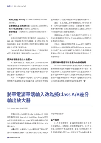 46 www.edntaiwan.comDESIGN IDEAS%u4f5c%u8005%uff1aMichael Wyatt%uff0cEDN%u7279%u7d04%u64b0%u8ff0%u5c07%u55ae%u96fb%u6e90%u55ae%u7aef%u8f38%u5165%u6539%u70ba%u64ecClass A/B%u5dee%u5206%u8f38%u51fa%u653e%u5927%u5668%u6839%u64daIEEE%u9662%u58eb/ADI%u9996%u4f4d%u9662%u58ebBarrie Gilbert%u5728%u300aIEEE%u56fa%u614b%u96fb%u8def%u300b(IEEE Journal of Solid-State Circuits)%u671f%u520a%u4e2d%u63d0%u51fa%u7684%u5fae%u6df7%u983b%u5668(micromixer)%u62d3%u64b2%u7d50%u69cb%uff0c%u63a1%u7528%u8a72%u62d3%u64b2%u7684%u653e%u5927%u5668%u53ef%u5c07%u55ae%u7aef%u8f38%u5165%u8f49%u63db%u70ba%u4f86%u81ea%u55ae%u96fb%u6e90%u7684Class A/B%u96fb%u6d41%u8f38%u51fa%u3002%u5982%u57161%u6240%u793a%uff0c%u8a72%u96fb%u8def%u7684LTspice%u5efa%u7f6e%u63a1%u7528%u4e86%u7368%u7279%u7684%u914d%u7f6e%uff0c%u75316%u9846%u96d9%u6975%u96fb%u6676%u9ad4(BJT)%u6839%u64da%u8f38%u5165%u6975%u6027%u300c%u5f15%u5c0e%u300d%u4f86%u81eaQ3%u548cQ4%u7684%u8f38%u51fa%u96fb%u6d41%u3002%u5de5%u4f5c%u539f%u7406C 1%u4f5c %u70ba %u9000 %u8026 %u96fb %u5bb9%uff0c%u4f7f Q1 %u57fa %u6975 %u7684 %u96fb %u4f4d %u80fd %u5920 %u76f8 %u5c0d%u65bc%u5176%u504f %u7f6e V b e ( %u900f %u904e Q1 %u4e8c%u6975 %u9ad4 %u9023 %u63a5 ) %u8b8a %u5316%u3002Q2 %u5728 %u6b63%u5411%u8f38%u5165%u8a0a%u865f%u6642%u4f5c %u70baQ1%u7684%u93e1%u50cf%uff0c%u7576%u8f38%u5165%u8a0a%u865f%u70ba%u8f03 %u5927%u7684%u8ca0%u503c%u6642%u5247%u95dc%u65b7%uff1b%u800cQ3 %u5728%u5c0f%u8a0a%u865f%u689d %u4ef6%u4e0b%u4f5c %u70ba%u758a%u63a5%u96fb %u8def%u2022%u8702%u5de2%u5f0f%u7db2%u8def(Cellular)%uff1a617MHz%u2013960MHz%u548c1710MHz%u20132690MHz%u2022%u5168%u7403%u5c0e%u822a%u885b%u661f%u7cfb%u7d71(GNSS)%uff1a1561MHz%u81f31606MHz%u2022Wi-Fi/BLE%u7121%u7dda%u96fb%uff1a2400MHz%u81f32485MHz%u2022%u7e3d%u983b%u7387%u7bc4%u570d%uff1a%u53ef%u5728400MHz%u81f38000MHz%u7684%u4efb%u4f55%u983b%u7387%u4e0b%u904b%u884c%u9019%u6b3e%u4e09%u57e0%u5929%u7dda%u53ef%u540c%u6642%u652f%u63f4%u884c%u52d5%u901a%u8a0a%u3001GNSS%u548cWi-Fi/BLE%uff0c%u6e1b%u5c11%u7269%u806f%u7db2%u88dd%u7f6e%u5167%u90e8%u5929%u7dda%u6578%u91cf%uff0c%u7c21%u5316%u6574%u5408%u6d41%u7a0b%uff0c%u964d%u4f4eBOM%u6210%u672c%uff0c%u4e26%u6e1b%u5c11%u5eab%u5b58%u9700%u6c42%uff0c%u540c%u6642%u8207%u4f7f%u7528%u4e09%u500b%u7368%u7acb%u5929%u7dda%u76f8%u8f03%u4e5f%u4e26%u4e0d%u81f3%u65bc%u5f71%u97ff%u6027%u80fd%u3002OMNIA%u7684%u61c9%u7528%u5305%u62ec%u8cc7%u7522%u8ffd%u8e64%u548c%u7269%u6d41%u3001%u6c7d%u8eca%u9060%u7aef%u8cc7%u8a0a%u8655%u7406%u3001%u667a%u6167%u8a08%u91cf%u548c%u5de5%u696d%u7269%u806f%u7db2(Industrial IoT)%u3002%u5c07%u5929%u7dda%u589e%u5f37%u5668%u6574%u5408%u65bc%u88dd%u7f6e%u4e2d%u70ba%u4e86%u7372%u5f97%u6700%u4f73%u6027%u80fd%uff0c%u9700%u8981%u5728%u8a2d%u8a08%u4e4b%u521d%u5c31%u8003%u616e%u5c07%u5929%u7dda%u589e%u5f37%u5668%u6574%u5408%u65bc%u5370%u5237%u96fb%u8def%u677f(PCB)%u3002%u901a%u5e38%uff0c%u9019%u4e9b%u5143%u4ef6%u7684%u6700%u4f73%u4f4d%u7f6e%u662fPCB%u63a5%u5730%u5e73%u9762%u7684%u89d2%u843d%uff0c%u5c24%u5176%u662f%u5728%u6700%u5927%u983b%u5bec%u61c9%u7528%u9700%u6c42%u4e4b%u8655%u3002%u7576%u7136%uff0c%u5982%u679c%u9019%u4e0d%u662f%u4e00%u500b%u91cd%u8981%u7684%u8003%u616e%u56e0%u7d20%uff0c%u90a3%u9ebc%u4f4d%u7f6e%u5c31%u4e0d%u90a3%u9ebc%u95dc%u9375%u4e86%u3002%u6b64%u5916%uff0c%u4e0b%u4e00%u6b65%u662f%u8a2d%u8a08%u5339%u914d%u7db2%u8def%uff0c%u9019%u4e00%u6b65%u53ef%u4ee5%u900f%u904e%u7522%u696d%u6a19%u6e96%u7684%u5fae%u6ce2%u96fb%u8def%u6a21%u64ec%u5668%u81ea%u52d5%u5b8c%u6210%u3002%u5de5%u7a0b%u5e2b%u4e0d%u9700%u8981%u7cbe%u901a%u5929%u7dda%u8a2d%u8a08%uff0c%u53ea%u9700%u8981%u5177%u5099%u5c04%u983b(RF)%u96fb%u8def%u8a2d%u8a08%u77e5%u8b58%u5373%u53ef%u3002%u6700%u5f8c%u4e00%u6b65%u662f%u6e2c%u8a66%u5929%u7dda%u7684%u96fb%u58d3%u99d0%u6ce2%u6bd4(VSWR)%u548c%u6548%u7387%u3002VSWR%u4f4e%u65bc3:1%u901a%u5e38%u53ef%u4ee5%u63a5%u53d7%uff0c%u4f46%u9019%u500b%u53c3%u6578%u4e0d%u662f%u552f%u4e00%u9700%u8981%u8003%u616e%u7684%u53c3%u6578%uff0c%u56e0%u70ba%u5339%u914d%u7db2%u8def%u5167%u90e8%u4ee5%u53ca%u5176%u4ed6%u5143%u4ef6%u548c%u6750%u6599%u5c0d%u8a0a%u865f%u7684%u5438%u6536%u53ef%u80fd%u6703%u9020%u6210%u640d%u8017%u3002%u6839%u64daOMNIA%u8a55%u4f30%u677f%uff0c%u5168%u5411%u5929%u7dda%u7684%u5e73%u5747%u6548%u7387%u5728%u4e0a%u8ff0%u6240%u6709%u4e09%u500b%u983b%u6bb5%u5747%u8d85%u904e55%%uff0c%u57281561-1606MHz%u7bc4%u570d%u5167%u7684%u5cf0%u503c%u6548%u7387%u8d85%u904e75%%u3002%u4f5c%u70ba%u53e6%u4e00%u500b%u7bc0%u7701%u6642%u9593%u7684%u9078%u64c7%uff0cIgnion%u7684AI%u5929%u7dda%u6574%u5408%u8a2d%u8a08%u5e73%u53f0Oxion%u8b93%u5de5%u7a0b%u5e2b%u80fd%u5920%u5373%u6642%u6e2c%u8a66Virtual Antenna%u8a2d%u8a08%u7684%u53ef%u884c%u6027%uff0c%u5305%u62ec%u589e%u5f37%u5668%u5143%u4ef6%u7684%u9078%u64c7%u3001%u4f4d%u7f6e%u8a2d%u7f6e%u548c%u5efa%u6a21%u6027%u80fd%u3002%u8a2d%u8a08%u6027%u80fd%u4e4b%u9593%u7684%u6b0a%u8861%u53ef%u4ee5%u900f%u904e%u7c21%u55ae%u7684%u62d6%u653e%u4ecb%u9762%u9032%u884c%u8abf%u6574%u3002%u865b%u64ec%u5929%u7dda%u4ee5%u9069%u61c9%u4e0d%u65b7%u767c%u5c55%u7684%u7269%u806f%u7db2%u683c%u5c40Virtual Antenna%u6280%u8853%u7684%u9748%u6d3b%u6027%uff0c%u4f7f%u5176%u975e%u5e38%u9069%u5408%u56e0%u61c9%u7121%u7dda%u7269%u806f%u7db2%u7522%u696d%u7684%u8da8%u52e2%uff0c%u5373%u900f%u904e%u6574%u5408%u5be6%u73fe%u5c0f%u578b%u5316%u3001%u63d0%u9ad8%u80fd%u6e90%u6548%u7387%u4ee5%u53ca%u66f4%u9ad8%u983b%u7387%u7684%u64cd%u4f5c%uff0c%u4ee5%u4fc3%u9032%u66f4%u9ad8%u7684%u8cc7%u6599%u901f%u7387%u3001%u66f4%u597d%u7684MIMO%u6280%u8853%u4ee5%u53ca%u9069%u61c9%u4e0d%u65b7%u6f14%u9032%u4e2d%u7684%u7121%u7dda%u5354%u8b70%u9700%u6c42%u3002%u96a8%u8457%u7121%u7dda%u6280%u8853%u7684%u4e0d%u65b7%u767c%u5c55%uff0c%u9019%u7a2e%u5275%u65b0%u7684%u5929%u7dda%u8a2d%u8a08%u65b9%u5f0f%u5c07%u6210%u70ba%u7269%u806f%u7db2%u88dd%u7f6e%u958b%u767c%u7684%u91cd%u8981%u8da8%u52e2%u3002