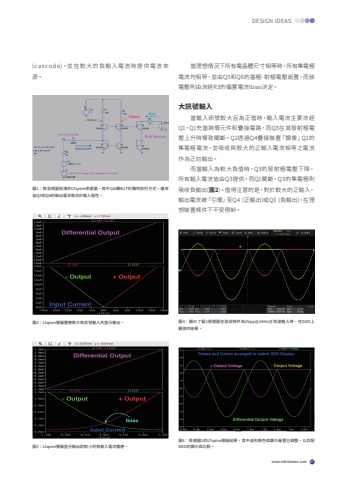 www.edntaiwan.com 47DESIGN IDEAS(c a s c o d e)%uff0c%u4e26 %u5728 %u8f03 %u5927 %u7684 %u8ca0%u8f38 %u5165%u96fb %u6d41 %u6642 %u63d0 %u4f9b %u96fb %u6d41 %u4f86%u6e90%u3002%u57161%uff1a%u5fae%u6df7%u983b%u5668%u62d3%u64b2%u7684LTspice%u539f%u7406%u5716%uff0c%u5176%u4e2d%u4ee56%u9846BJT%u7684%u7368%u7279%u6392%u5217%u65b9%u5f0f%uff0c%u8b93%u4f86%u81eaQ3%u548cQ4%u7684%u8f38%u51fa%u96fb%u6d41%u53d6%u6c7a%u65bc%u8f38%u5165%u6975%u6027%u3002%u7576%u7406%u60f3%u60c5%u6cc1%u4e0b%u6240%u6709%u96fb%u6676%u9ad4%u5c3a%u5bf8%u76f8%u7b49%u6642%uff0c%u6240%u6709%u96c6%u96fb%u6975%u96fb%u6d41%u5747%u76f8%u7b49%uff0c%u4e26%u7531Q5%u548cQ6%u7684%u57fa%u6975-%u5c04%u6975%u96fb%u58d3%u8a2d%u7f6e%uff0c%u800c%u8a72%u96fb%u58d3%u5247%u7531%u6d41%u7d93R3%u7684%u504f%u7f6e%u96fb%u6d41Ibias%u6c7a%u5b9a%u3002%u5927%u8a0a%u865f%u8f38%u5165%u7576%u8f38%u5165%u8a0a%u865f%u8f03%u5927%u4e14%u70ba%u6b63%u503c%u6642%uff0c%u8f38%u5165%u96fb%u6d41%u4e3b%u8981%u6d41%u7d93Q1%uff0cQ1%u5145%u7576%u8de8%u5c0e%u5143%u4ef6%u548c%u758a%u63a5%u96fb%u8def%uff0c%u800cQ3%u5728%u5176%u767c%u5c04%u6975%u96fb%u58d3%u4e0a%u5347%u6642%u5c0e%u81f4%u95dc%u65b7%u3002Q2%u900f%u904eQ4%u758a%u63a5%u88dd%u7f6e%u300c%u93e1%u50cf%u300dQ1%u7684%u96c6%u96fb%u6975%u96fb%u6d41%uff0c%u4e26%u5438%u6536%u8207%u8f03%u5927%u7684%u6b63%u8f38%u5165%u96fb%u6d41%u76f8%u7b49%u4e4b%u96fb%u6d41%u4f5c%u70ba%u6b63%u5411%u8f38%u51fa%u3002%u800c%u7576%u8f38%u5165%u70ba%u8f03%u5927%u8ca0%u503c%u6642%uff0cQ3%u7684%u767c%u5c04%u6975%u96fb%u58d3%u4e0b%u964d%uff0c%u6240%u6709%u8f38%u5165%u96fb%u6d41%u7686%u7531Q3%u63d0%u4f9b%uff0c%u800cQ1%u95dc%u65b7%uff0cQ3%u7684%u96c6%u96fb%u6975%u5247%u5438%u6536%u8ca0%u8f38%u51fa(%u57162)%u3002%u503c%u5f97%u6ce8%u610f%u7684%u662f%uff0c%u5c0d%u65bc%u8f03%u5927%u7684%u6b63%u8f38%u5165%uff0c%u8f38%u51fa%u96fb%u6d41%u88ab%u300c%u5f15%u5c0e%u300d%u81f3Q4 (%u6b63%u8f38%u51fa)%u6216Q3 (%u8ca0%u8f38%u51fa)%uff0c%u5728%u7406%u60f3%u88dd%u7f6e%u689d%u4ef6%u4e0b%u4e0d%u53d7%u9650%u5236%u3002%u57162%uff1aLtspice%u6a21%u64ec%u97ff%u61c9%u8f03%u5927%u8ca0%u8a0a%u865f%u8f38%u5165%u7684%u5dee%u5206%u8f38%u51fa%u3002%u57163%uff1aLtspice%u6a21%u64ec%u5dee%u5206%u8f38%u51fa%u5c0d%u8f03%u5c0f%u7684%u8ca0%u8f38%u5165%u96fb%u6d41%u97ff%u61c9%u3002%u57164%uff1a%u986f%u793a%u4e86%u57161%u539f%u7406%u5716%u5728%u6e2c%u8a66%u689d%u4ef6%u70ba2Vpp@1KHz%u6b63%u5f26%u6ce2%u8f38%u5165%u6642%uff0c%u5728DSO%u4e0a%u89c0%u6e2c%u7684%u7d50%u679c%u3002%u57165%uff1a%u6839%u64da%u57161%u7684LTspice%u6a21%u64ec%u7d50%u679c%uff0c%u5176%u4e2d%u6ce2%u5f62%u984f%u8272%u8207%u986f%u793a%u504f%u7f6e%u5df2%u8abf%u6574%uff0c%u4ee5%u5339%u914dDSO%u7684%u986f%u793a%u8207%u6bd4%u8f03%u3002
