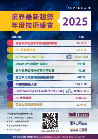 %u6383QRcode%u77ad%u89e3%u66f4%u591a%u8cc7%u8a0a%u66f4%u591a%u5b9a%u5236%u5316%u6d3b%u52d5%uff0c %u8acb%u806f%u7e6b%uff1a Michael.Sun@aspencore.com (886-2) 2759-1366 Ext. 300%u4e0d%u53ef%u932f%u904e%u7684%u5c16%u7aef%u6280%u8853%u7814%u8a0e%u6703%uff1a%u2022 %u5c08%u696d %u3001%u7cbe%u6e96%u7684%u96fb%u5b50%u5de5%u7a0b%u8cc7%u8a0a%u2022 %u5168%u9762 %u3001%u5b8c%u6574%u7684%u6280%u8853%u5206%u6790%u2022 %u76f4%u63a5%u63a5%u89f8%u6280%u8853%u767c%u8868%u5ee0%u5546%u2022 %u6df1%u5165%u4ea4%u6d41%u4e92%u52d5%u696d%u754c%u6700%u65b0%u8da8%u52e2%u5e74%u5ea6%u6280%u8853%u76db%u6703 2025%u5bec%u80fd%u9699%u6280%u8853%u66a8%u672a%u4f86%u61c9%u7528%u570b%u969b%u8ad6%u58c7 3%u670819%u65e5AI+ %u6280%u8853%u7814%u8a0e%u6703 4%u670817%u65e5EE Power Asia (EPA) 5%u670827~28%u65e5Smart eMobility Taipei 6%u67084%u65e5%u5d4c%u5165%u5f0f%u7cfb%u7d71%u8207AIoT%u6280%u8853%u7814%u8a0e%u6703 7%u67082%u65e5%u9ad8%u529f%u7387%u5143%u4ef6%u66a8%u8f49%u63db%u6280%u8853%u7814%u8a0e%u6703 8%u67087%u65e5EE%u524d%u77bb%u6280%u8853%u5927%u6703 10%u67081~2%u65e5Electronics Asia Conference (EAC) 10%u670828~29%u65e5EE %u5927%u5e2b%u8ad6%u58c7 11%u670819%u65e5%u4e9e%u6d32%u91d1%u9078%u734e%u9812%u734e%u5178%u79ae 12%u67084%u65e5%u6d3b%u52d5%u540d%u7a31 Date