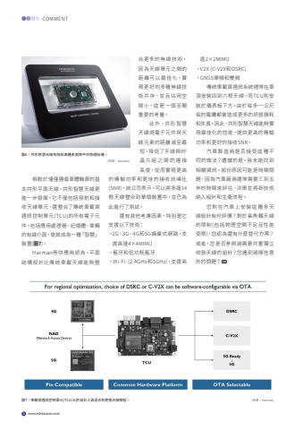 6 www.edntaiwan.comCOMMENT%u76f8%u8f03%u65bc%u50c5%u50c5%u9075%u5faa%u8eca%u9ad4%u8f2a%u5ed3%u7684%u57fa%u672c%u5171%u5f62%u5e73%u9762%u5929%u7dda%uff0c%u5171%u5f62%u667a%u6167%u5929%u7dda%u66f4%u9032%u4e00%u6b65%u767c%u5c55%u3002%u5b83%u4e0d%u50c5%u5305%u62ec%u767c%u5c04%u548c%u63a5%u6536%u5929%u7dda%u55ae%u5143%uff0c%u9084%u6574%u5408%u4e86%u50b3%u7d71%u8eca%u8f09%u8cc7%u901a%u8a0a%u63a7%u5236%u55ae%u5143(TCU)%u7684%u6240%u6709%u96fb%u5b50%u5143%u4ef6%uff0c%u5305%u62ec%u61c9%u7528%u8655%u7406%u5668%u3001%u8a18%u61b6%u9ad4%u3001%u8eca%u8f1b%u7684%u6709%u7dda%u4ecb%u9762%uff0c%u4f7f%u5176%u6210%u70ba%u4e00%u7a2e%u300c%u667a%u6167%u300d%u88dd%u7f6e(%u57167)%u3002Harman%u7b49%u4f9b%u61c9%u5546%u8a8d%u70ba%uff0c%u5e73%u9762%u7d50%u69cb%u8a2d%u8a08%u6bd4%u50b3%u7d71%u8eca%u8f09%u5929%u7dda%u80fd%u5920%u6574%u57167%uff1a%u8eca%u8f09%u8cc7%u901a%u8a0a%u63a7%u5236%u55ae%u5143(TCU)%u5141%u8a31%u8a2d%u8a08%u4eba%u54e1%u6df7%u5408%u548c%u66f4%u63db%u5929%u7dda%u6a21%u7d44%u3002 (%u4f86%u6e90%uff1aHarman)%u5408%u66f4%u591a%u7684%u7121%u7dda%u6280%u8853%uff0c%u56e0%u70ba%u5929%u7dda%u55ae%u5143%u4e4b%u9593%u7684%u8ddd %u96e2%u53ef%u4ee5 %u6700 %u4f73 %u5316%uff0c%u5be6%u73fe%u66f4%u597d%u7684%u591a%u7a2e%u7121%u7dda%u6280%u8853%u5171 %u5b58%uff0c%u4e26 %u4e14%u4f54 %u7528%u7a7a%u9593%u5c0f%uff0c%u9019 %u662f %u4e00 %u500b%u81f3%u95dc%u91cd%u8981%u7684%u8003%u91cf%u3002%u6b64 %u5916%uff0c%u5171 %u5f62 %u667a%u6167%u5929%u7dda%u5c07%u96fb%u5b50%u5143%u4ef6%u8207%u5929%u7dda%u5143%u7d20%u7684%u8ddd%u96e2%u6e1b%u81f3%u6700%u77ed%uff0c%u964d%u4f4e%u4e86%u5929%u7dda%u8207RF%u6676%u7247%u7d44%u4e4b%u9593%u7684%u9023%u63a5%u9577%u5ea6%uff0c%u5f9e%u800c%u5be6%u73fe%u66f4%u9ad8%u7684%u50b3%u8f38%u529f%u7387%u548c%u66f4%u4f73%u7684%u63a5%u6536%u8a0a%u566a%u6bd4(SNR)%u3002%u8a72%u516c%u53f8%u8868%u793a%uff0c%u53ef%u4ee5%u5c07%u591a%u905414%u6839%u5929%u7dda%u6574%u5408%u5230%u55ae%u500b%u88dd%u7f6e%u4e2d%uff0c%u4e26%u5df2%u70ba%u6b64%u9032%u884c%u4e86%u6e2c%u8a66%u3002%u9084%u6709%u5176%u4ed6%u8003%u616e%u56e0%u7d20%uff0c%u7279%u5225%u662f%u5b83%u652f%u63f4%u4ee5%u4e0b%u6280%u8853%uff1a%u30fb2G%u30013G%u30014G%u548c5G%u8702%u5de2%u5f0f%u7db2%u8def%uff0c%u652f%u63f4%u9ad8%u90544%u00d74MIMO%u30fb%u85cd%u7259%u548c%u4f4e%u529f%u8017%u85cd%u7259%u30fbWi-Fi (2.4GHz%u548c5GHz)%uff0c%u652f%u63f4%u9ad8%u90542%u00d72MIMO%u30fbV2X (C-V2X%u548cDSRC)%u30fbGNSS%u55ae%u983b%u548c%u96d9%u983b%u50b3%u7d71%u8eca%u8f09%u8cc7%u901a%u8a0a%u7cfb%u7d71%u901a%u5e38%u5728%u8eca%u9802%u5b89%u88dd%u56db%u5230%u516d%u6839%u5929%u7dda%uff0c%u800cTCU%u5247%u5b89%u88dd%u65bc%u5100%u8868%u677f%u4e0b%u65b9%u3002%u7531%u65bc%u6bcf%u591a%u4e00%u516c%u5c3a%u9577%u7684%u96fb%u7e9c%u90fd%u6703%u9020%u6210%u66f4%u591a%u7684%u8a0a%u865f%u640d%u8017%u548c%u5931%u771f%uff0c%u56e0%u6b64%uff0c%u5171%u5f62%u667a%u6167%u5929%u7dda%u80fd%u5920%u5be6%u73fe%u6700%u4f73%u5316%u7684%u6027%u80fd%uff0c%u63d0%u4f9b%u66f4%u9ad8%u7684%u50b3%u8f38%u529f%u7387%u548c%u66f4%u597d%u7684%u63a5%u6536SNR%u3002%u6c7d%u8eca%u88fd%u9020%u5546%u662f%u5426%u63a5%u53d7%u9019%u7a2e%u4e0d%u540c%u7684%u505a%u6cd5%uff1f%u907a%u61be%u7684%u662f%uff0c%u6211%u672a%u80fd%u627e%u5230%u76f8%u95dc%u8cc7%u8a0a%u3002%u90e8%u4efd%u539f%u56e0%u53ef%u80fd%u662f%u6642%u9593%u554f%u984c%uff0c%u56e0%u70ba%u6c7d%u8eca%u5ee0%u5546%u901a%u5e38%u9700%u8981%u4e09%u5230%u4e94%u5e74%u7684%u6642%u9593%u4f86%u8a55%u4f30%u3001%u6c7a%u7b56%u4e26%u5c07%u65b0%u6280%u8853%u7d0d%u5165%u8a2d%u8a08%u548c%u751f%u7522%u6d41%u7a0b%u3002%u60a8%u5c0d%u5728%u6c7d%u8eca%u4e0a%u5b89%u88dd%u9019%u7a2e%u591a%u5929%u7dda%u8a2d%u8a08%u6709%u4f55%u8a55%u50f9%uff1f%u5c0d%u65bc%u9bca%u9b5a%u9c2d%u5929%u7dda%u7684%u9650%u5236(%u5305%u62ec%u7269%u7406%u7a7a%u9593%u4e0d%u8db3%u4e14%u6027%u80fd%u53d7%u9650)%uff0c%u60a8%u8a8d%u70ba%u9084%u6709%u4ec0%u9ebc%u66ff%u4ee3%u65b9%u6848%uff1f%u6216%u8005%uff0c%u60a8%u662f%u5426%u53c3%u8207%u904e%u9700%u8981%u5171%u7f6e%u7368%u7acb%u6536%u767c%u5929%u7dda%u7684%u8a2d%u8a08%uff1f%u60a8%u9047%u5230%u904e%u54ea%u4e9b%u610f%u5916%u7684%u554f%u984c%uff1f%u57166%uff1a%u5171%u5f62%u667a%u6167%u5929%u7dda%u63a1%u7528%u8207%u8eca%u9ad4%u8868%u9762%u9f4a%u5e73%u7684%u7269%u7406%u7d50%u69cb%u3002 (%u4f86%u6e90%uff1aHarman)